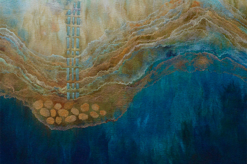 Caroline works from her rural studio in Franklin, Auckland. She creates abstract fibre artworks, often with 3-dimensional elements. Wisps of wool and silk fibre are used as painterly brush strokes.